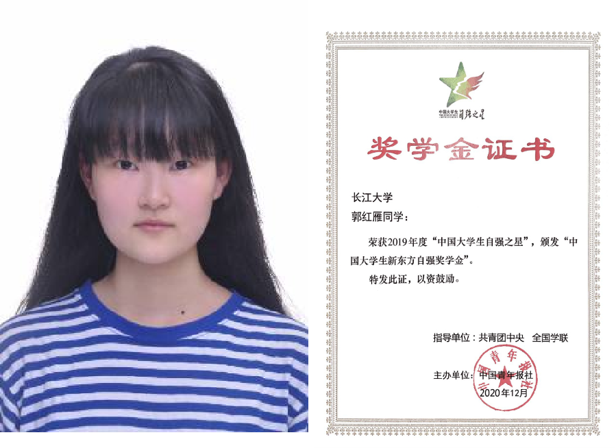 在校期间,她每天早上五点半就起床给妈妈做饭,把妈妈安顿好之后再赶去上学;放学后,她又急匆匆地赶回宿舍,为妈妈做饭、洗衣、按摩,陪妈妈说话,直到晚上才安下心来学习。她用孝心报达母亲,用勤奋书写人生。大学期间,郭红雁同学积极进取,不仅学习成绩优异,而且政治品德优良,先后被评为“荆州好人”、“36365线路检测中心入口十佳明星”、“湖北省向上向善好青年”、“湖北省大学生自强之星标兵”等荣誉称号,多次荣获“国家励志奖学金”、“36365线路检测中心入口奖学金”。2020年6月8日,她光荣地加入中国共产党,在鲜艳的党旗下向党作出了庄严承诺。