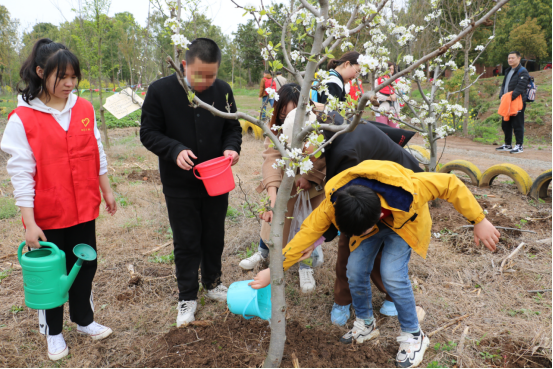 在植树活动中,“糖宝”家庭与志愿者们分成4个小组,相互协作,挥锹挖坑、扶树定根、培实新土、提水浇灌,合力栽下一棵棵梨树苗。经过大家的辛勤努力,新植树苗迎风而立,为春天增添了一抹新绿。